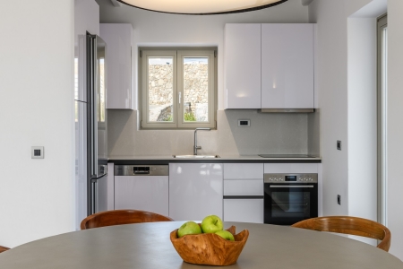 Villa Aqua Lux provides three double bedrooms with two of them being en-suite. It may comfortably accommodate up to 6 guests. Indoors, it features elegant contemporary interior decoration with minimal touches. Bright living room and dining area with beautiful sea views, bedrooms dressed with carefully selected details offering elegance and comfort. The private swimming pool with its hydromassage feature is situated on the main level at the back surrounded by well-maintained gardens and lounge areas. Sunbathe around the pool and unwind or escape from the midday heat in the shady outdoor sitting areas under the pergola.