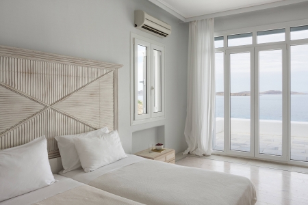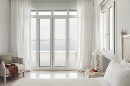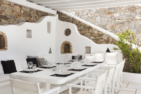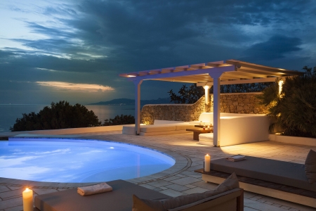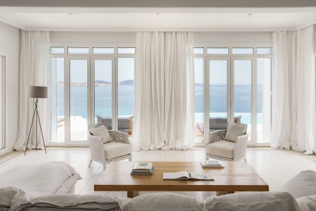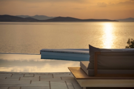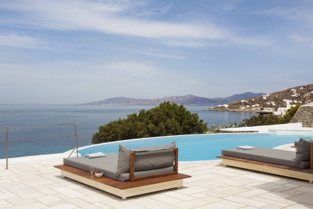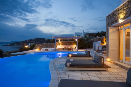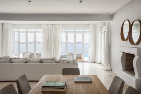 The construction and architecture of the villa is a flawless combination of modern and traditional Mykonian. The house is surrounded by a very spacious white-marble terrace and superb huge pond-style waterfront infinity pool.