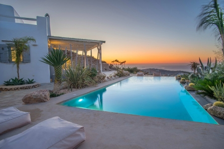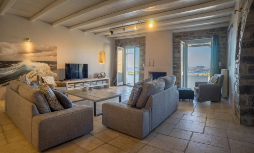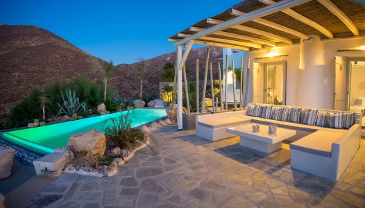 Villa Mercy is a 4 bedroom villa with private pool, located in the west part of the island of Paros, very close to the capital of Paros, Parikia, and the beautiful beaches. This brilliantly location has the highest elevation on the island offering to their privileged guests a stunning panoramic view of sunsets, the Aegean Sea and the town of Parikia. Villa Mercy is built in a plot of 5.000 sq.m with the local Cycladic architecture combined with modern design. The combination of the white-colour walls and the stone gives an elegant and relaxing atmosphere for unforgettable holidays. The villa is decorated with elegant furniture and consists of 2 levels.