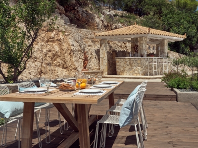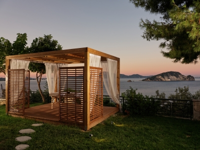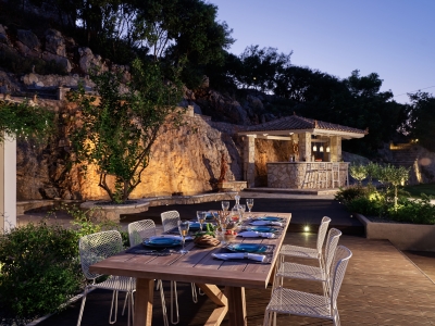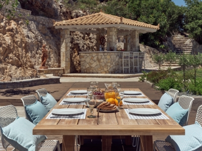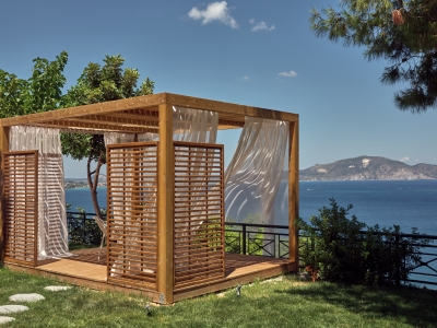 The estate is set upon a ridge over the Ionian Sea overlooking Marathonisi Island with a magnificent unobstructed view of the azure blue sea, approx. 200 meters from the nearest beach. The villa is built upon a hillside and is situated in a natural forest of pine and fir, on a plot of approx. 10,000 square meters, providing an environment of peace, tranquility and privacy.